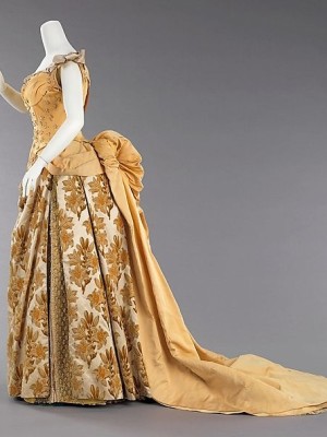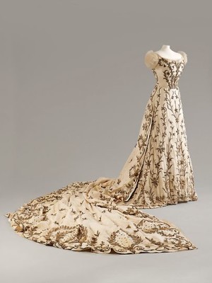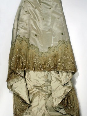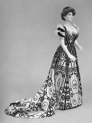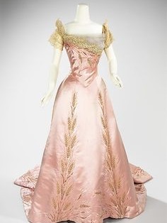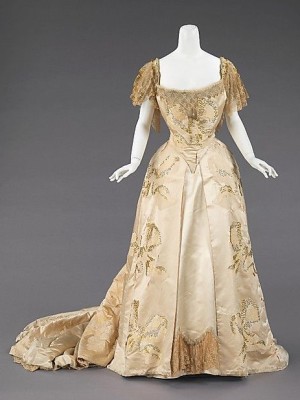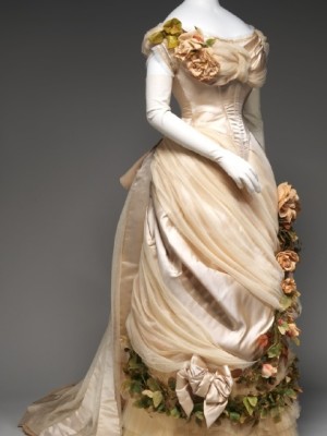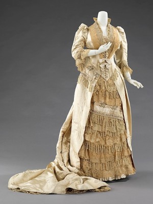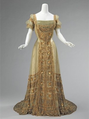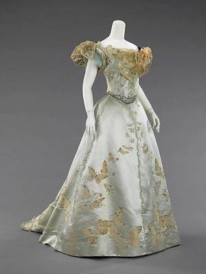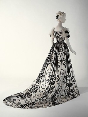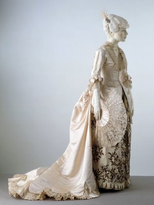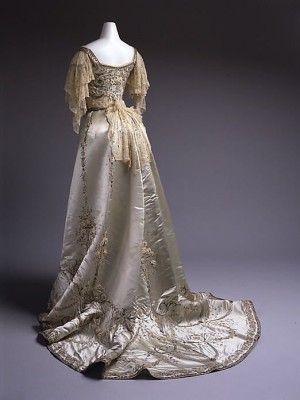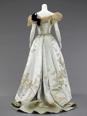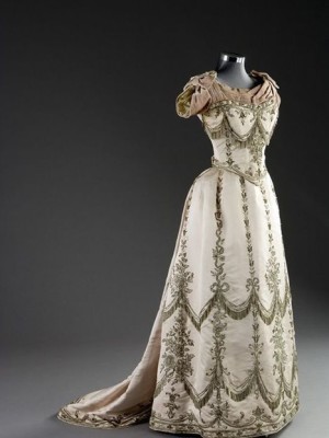 • Laces, trims, elaborate embroidery, layers, scalloped edges, decorative flowers, birds, bows. Dresses were very ornate for evening wear.